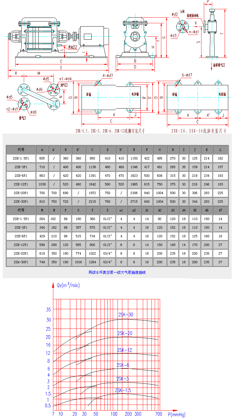 2SK系列適用于吸入壓力低于-0.08MPa的工況條件。2SK-P1系列適用于吸入壓力低于-0.096MPa的工況條件,在配用大氣泵時(shí),極限真空度可達(dá)-750mmHg。